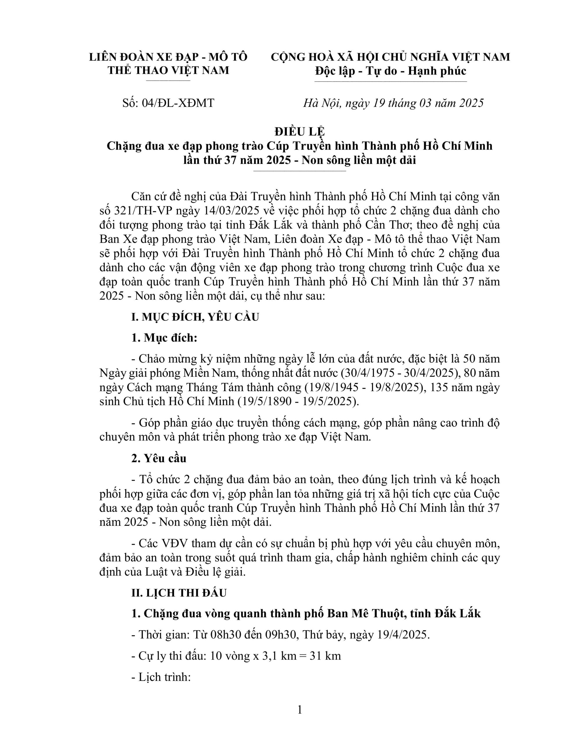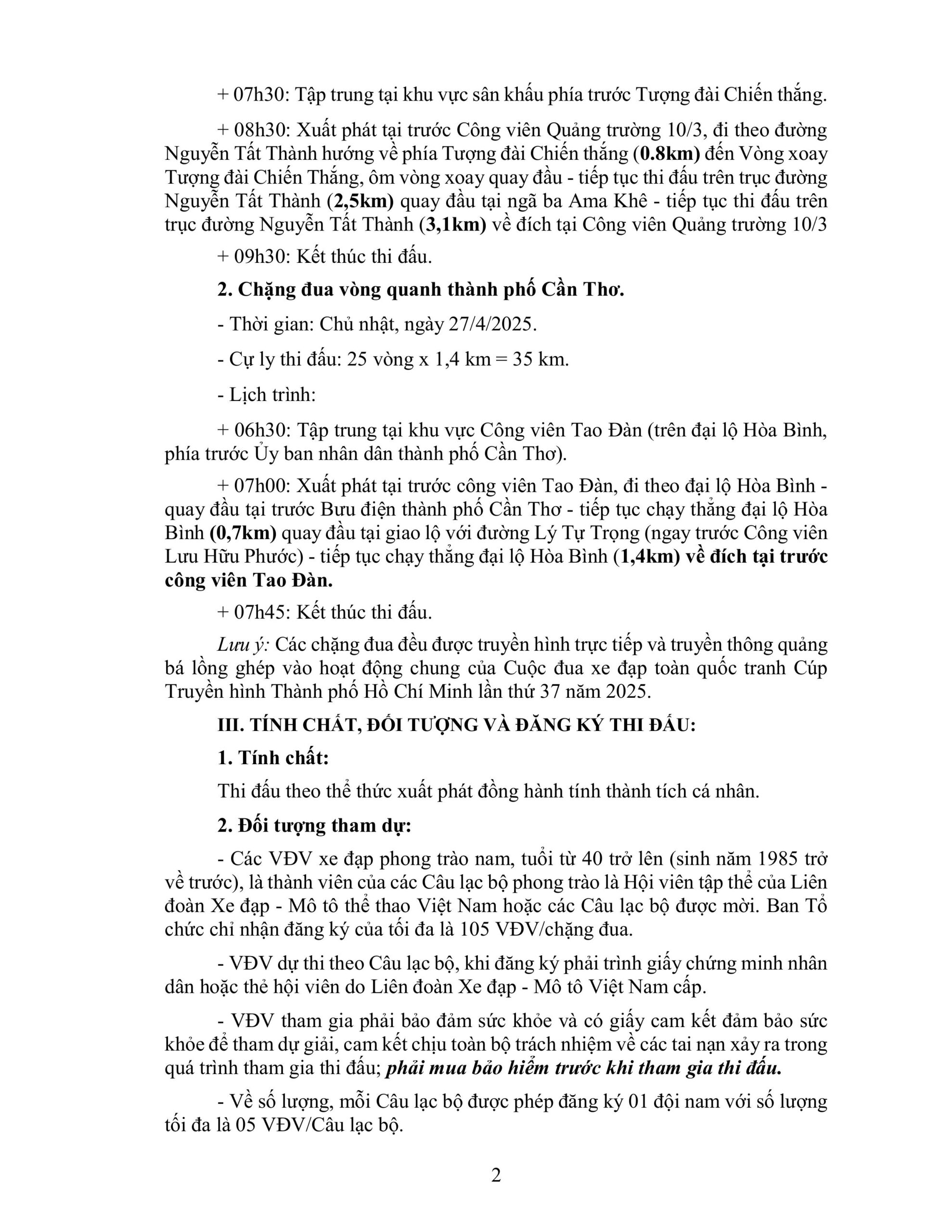 Điều lệ Giải, Tin tức Điều lệ: Chặng đua xe đạp phong trào Cúp Truyền hình TP. HCM lần thứ 37 năm 2025 – Non sông liền một dải