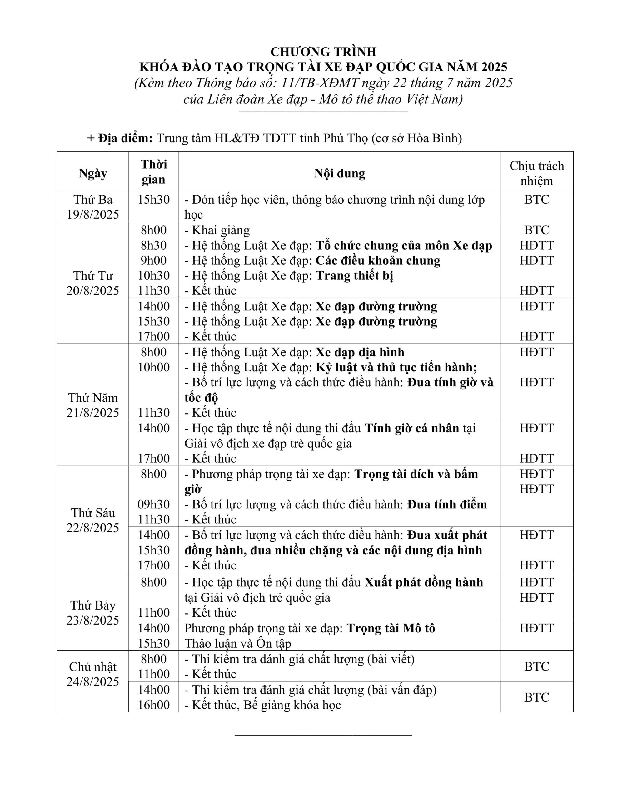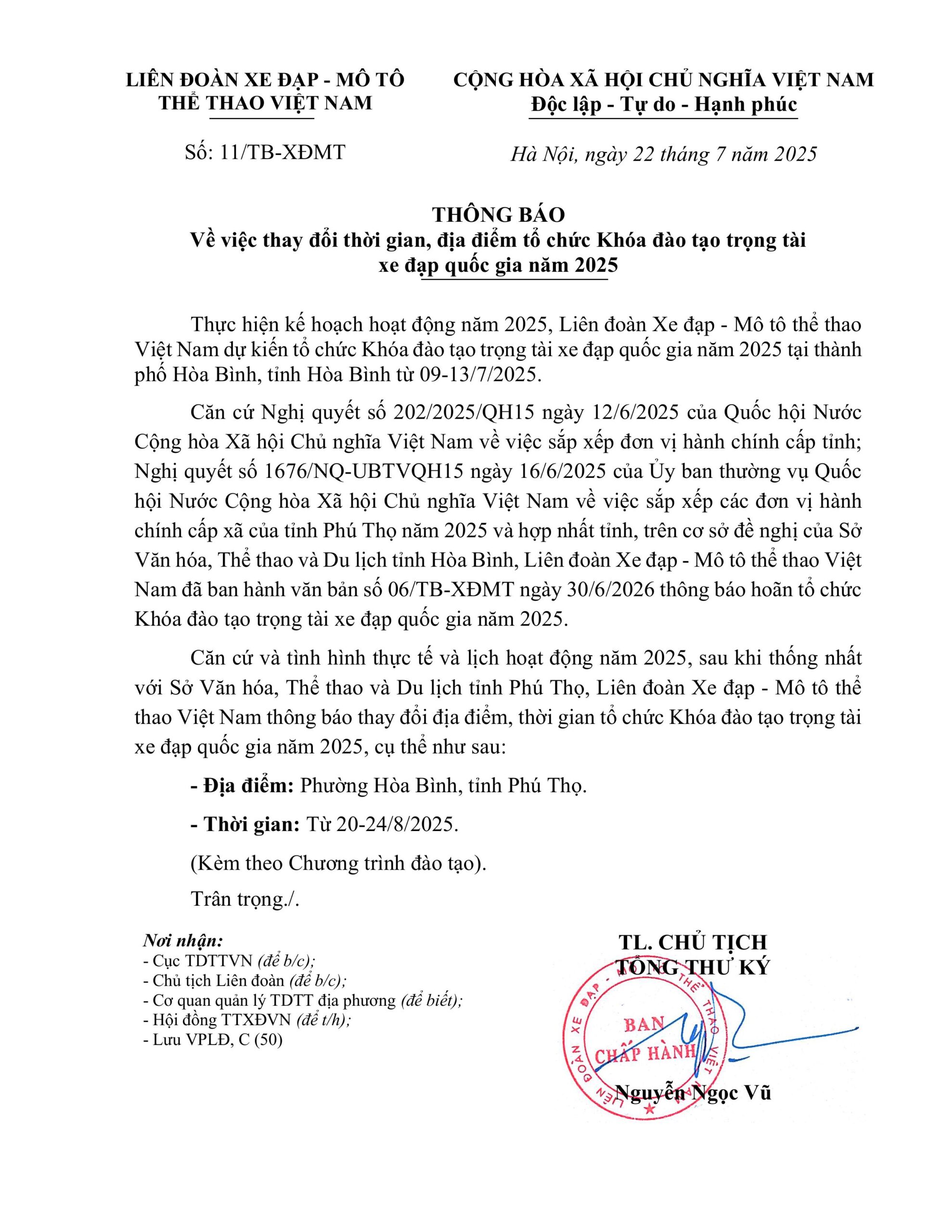 TB: về việc đổi thời gian, địa điểm tổ chức Khoá đào tạo trọng tài xe đạp quốc gia năm 2025